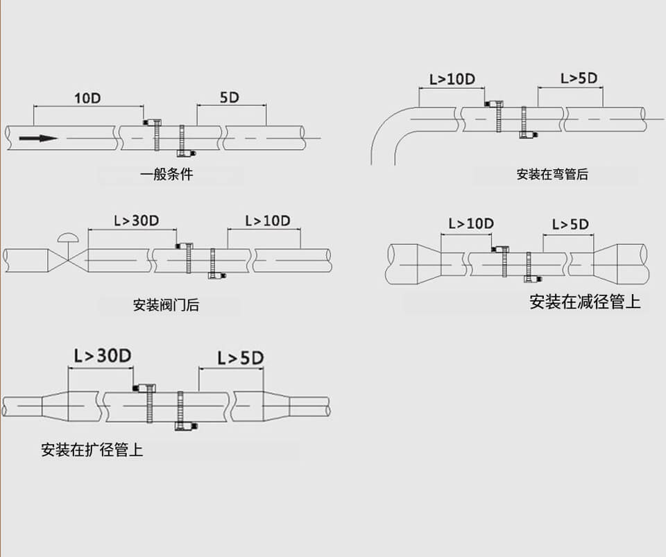 為保證流量計(jì)的測(cè)量精度,流量計(jì)附近安裝的直管段長(zhǎng)度盡量滿足以下要求:上游>20D,下游>10D。